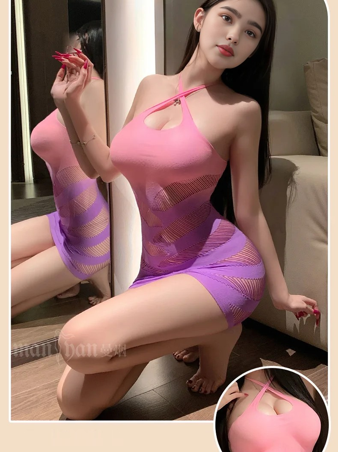 Vestido de malla de lencería con pecho abierto, diseñado para resaltar tu figura de manera seductora. Con un elegante degradado en tonos azules, este vestido combina sensualidad y estilo.